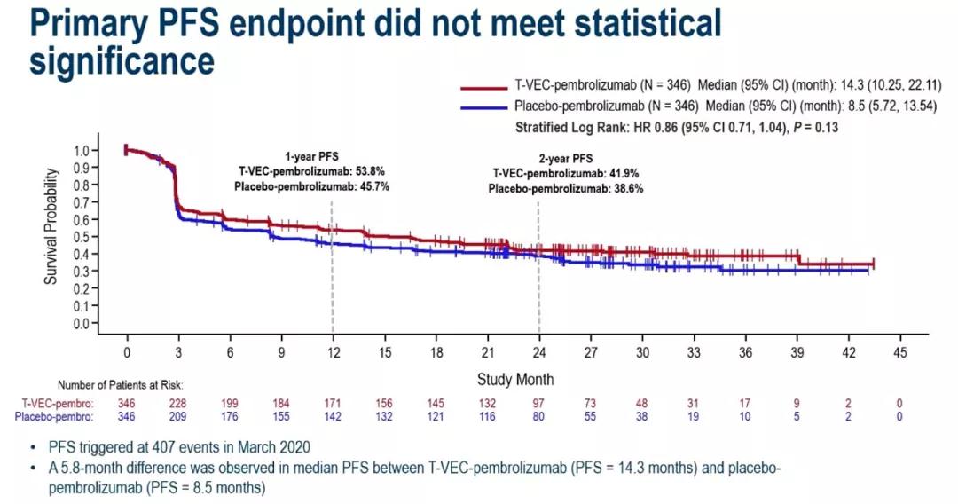 纳入患者为不可切除的IIIB-IV M1c期、未经抗PD-1治疗、具有可注射病灶的MEL患者,按1:1随机分为T+P组或Pbo+P组。T首次给药为≤4 x 106 PFU,三周后为≤4 x 108 PFU,Q2W直至第5剂,然后是Q3W。静脉注射P 200 mg Q3W。主要终点是通过盲法独立中心审查根据mRECIST 1.1评估的无进展生存期(PFS)和总生存期(OS)。次要终点包括客观缓解率(ORR)、完全缓解率(CRR)、持久缓解率(DRR)、缓解持续时间(DOR)和安全性。此处报告的结果为首次PFS和中期OS分析(数据截止时间/DOC:PFS 2020年3月2日;OS 2020年9月29日)。