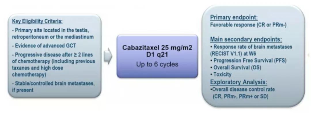 卡巴他赛等紫杉类在GCT中具有良好的抗肿瘤活性,而且卡巴他赛可以通过血脑屏障,外周神经毒性较小。本次ESMO大会的迷你口头报告中,来自意大利米兰-IRCCS基金国家肿瘤研究中心的Giulia Baciarello汇报了一项卡巴他赛治疗晚期GCT的2期CABA-GCT试验结果。