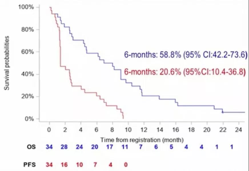 6个月PFS率为20.6%(95%CI:10.4~36.8),6个月OS为58.8%(95%CI:42.2~73.6)。