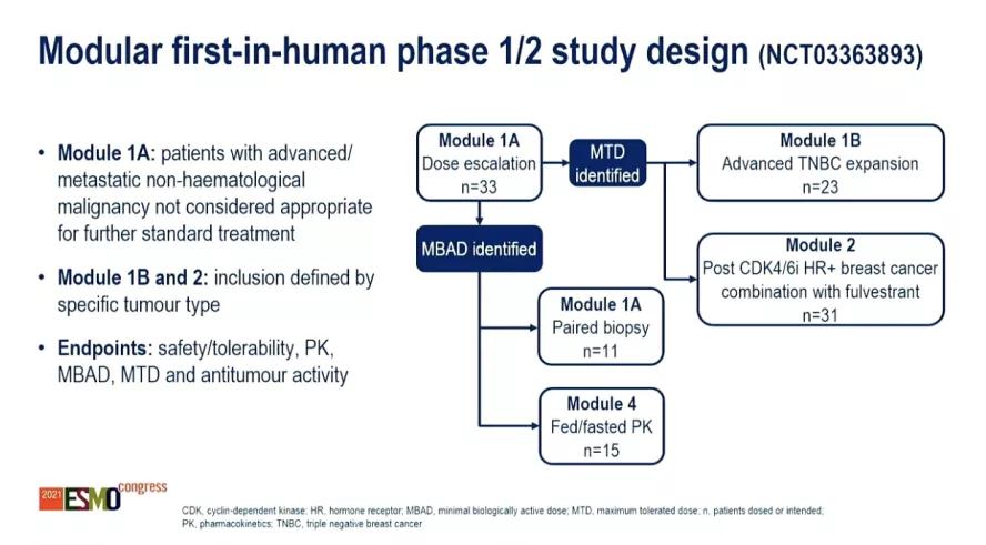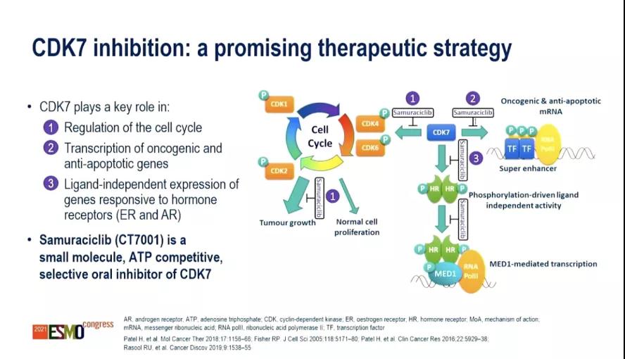 CDK7是一个关键激酶,可以调节细胞分裂;控制致癌基因转录;调控核受体功能,尤其是雌激素受体。早在20多年前,就已经有研究发现肿瘤细胞中CDK7表达增高,在小鼠移植瘤实验中,CDK7抑制剂具有良好的耐受性并有效减少体内肿瘤的生长。本次ESMO会议报道的一项口服、选择性CDK7抑制剂samuraciclib(CT7001)治疗晚期恶性实体瘤的首次人体、模块化I/II期临床研究的结果,让我们看到在三种CDK4/6抑制剂在临床上获得巨大成功之后,CDK7抑制剂有望成为抗肿瘤药物中最具希望最具前景的新一类的CDKs选择性抑制剂。