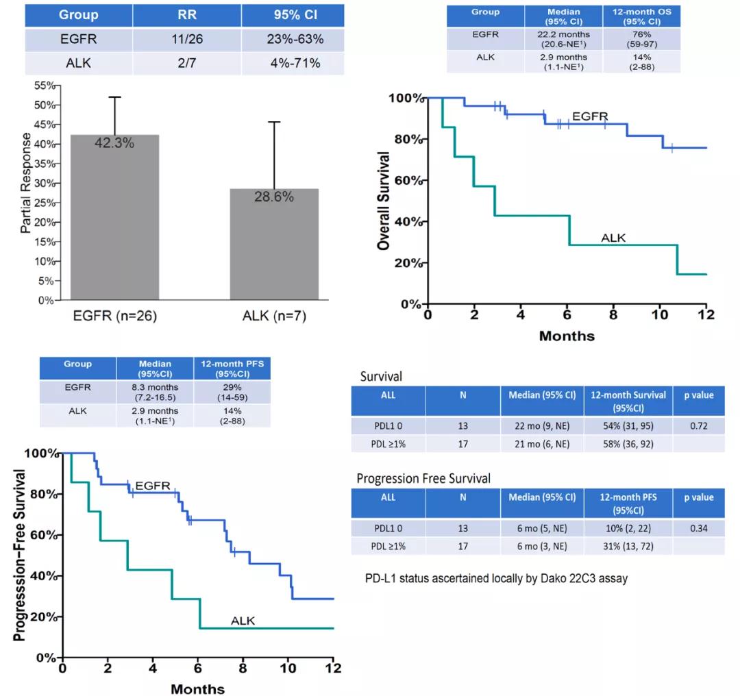 研究共纳入33例患者,EGFR+和ALK+分别为26例和7例。免疫联合化疗治疗EGFR+和ALK+患者ORR分别为42%和29%。总人群PFS为7.3个月,12个月PFS率为26%,中位OS为20.6个月,12个月OS率为61%。其中,26例EGFR+患者的中位PFS为8.3个月,12月PFS率29%,中位OS位22.2个月,12个月OS率76%。7例ALK+患者的中位PFS为2.9个月,12个月PFS率为14%,中位OS为2.9个月,12个月OS率14%。亚组分析发现,17例患者PD-L1≥1%,但PD-L1≥1%和<1%组患者的获益未见明显差异。(见图1)