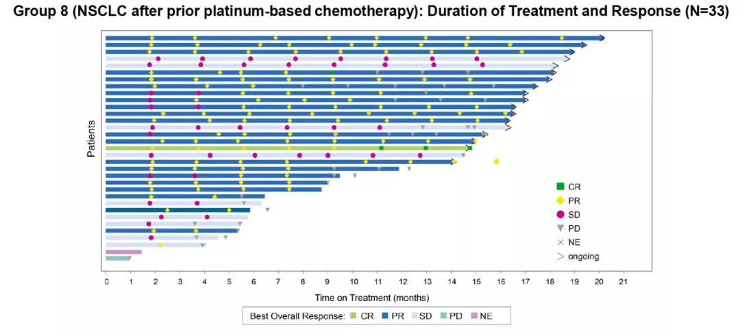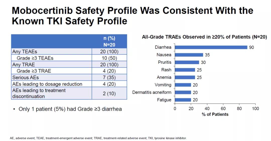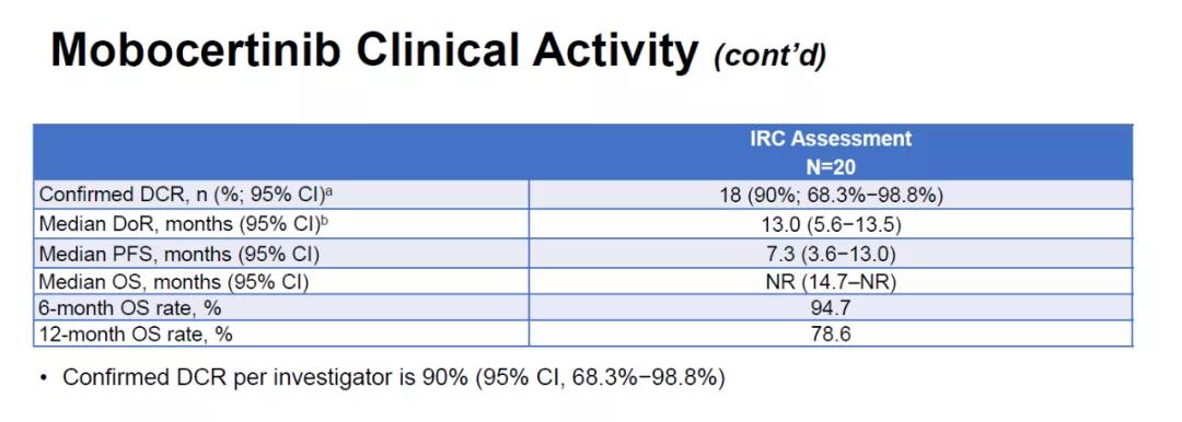 这项研究表明,Mobocertinib对既往接受EGFR-TKI治疗且疾病控制≥6月后进展的EGFR 20ins晚期NSCLC具有一定疗效,ORR可达40%,DOR能达13个月,且安全可控。