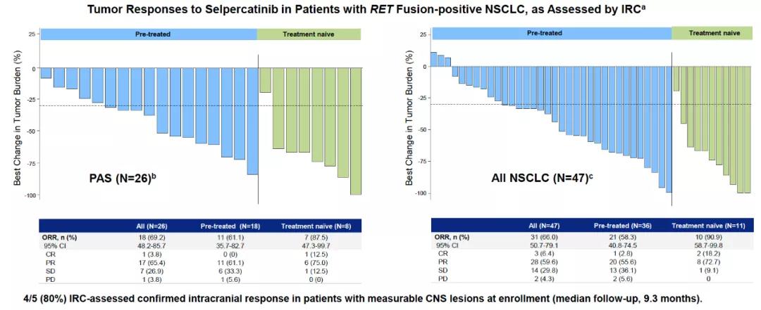 另一项ARROW研究中国队列评估了Pralsetinib治疗中国RET+晚期NSCLC的疗效和安全性。中国队列共招募了68名患者,其中37例经铂类化疗的,31例既往没有接受过全身治疗。