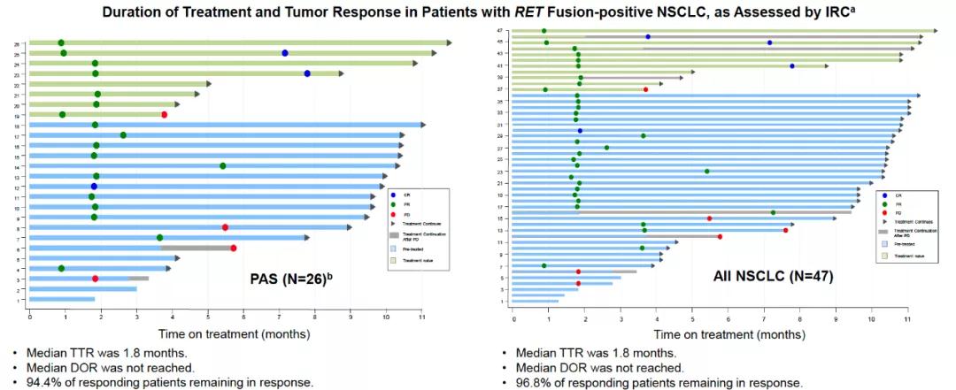 LIBETTO-321研究是一项旨在评估Selpercatinib用于中国初治或经治的局部晚期或转移性RET融合阳性的实体瘤患者疗效与安全性的开放标签、多中心、2期临床试验。共招募77例RET+晚期实体瘤中国患者,包括47例RET+NSCLC,其中26人被纳入主要分析组(PAS)。在26名PAS患者中,IRC评估的ORR为69.2%,8例初治患者的ORR达87.5%,18例经治患者为61.1%。中位起效时间(TTR)为1.8个月,中位DOR未达到,94.4%的患者仍保持应答(中位随访9.7个月)。
