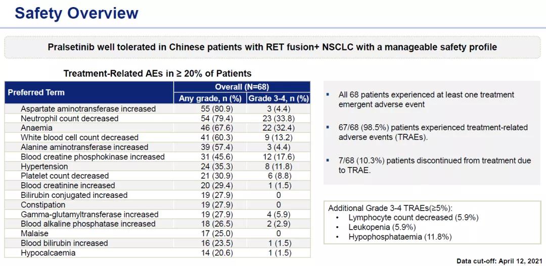 对既往接受过化疗的患者,中位随访17.0个月后, ORR为 66.7%。3%的患者获得CR,63.6%达PR。中位起效时间为1.89个月。6个月和9个月DOR率分别为77.3%和50.0% 。中位治疗持续时间为14.65个月。在既往未接受治疗的患者中,中位随访时间8.2个月,ORR达80%,其中6.7%获得CR,73.3% 为PR。中位起效时间为1.87个月。6个月和9个月DOR率分别为76.7%和38.3%。中位治疗持续时间为7.13个月。两类患者中分别有68.18% 和79.17% 的应答者继续接受治疗。Pralsetinib在中国人群中同样显示出安全性可控,具有良好的耐受性。98.5%的患者有TRAEs,10.3%因TRAE停药,发生率≥5%的≥3级TRAE包括淋巴细胞计数减少 (5.9%)、白细胞减少 (5.9%) 和低磷酸盐血症 (11.8%)。(见图7)