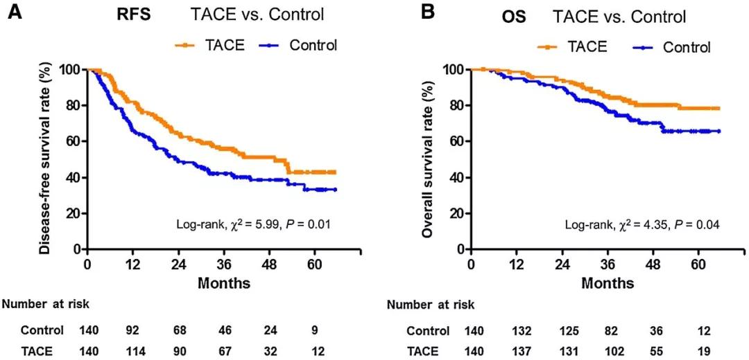 图2、术后辅助性TACE治疗可显著改善RFS和OS