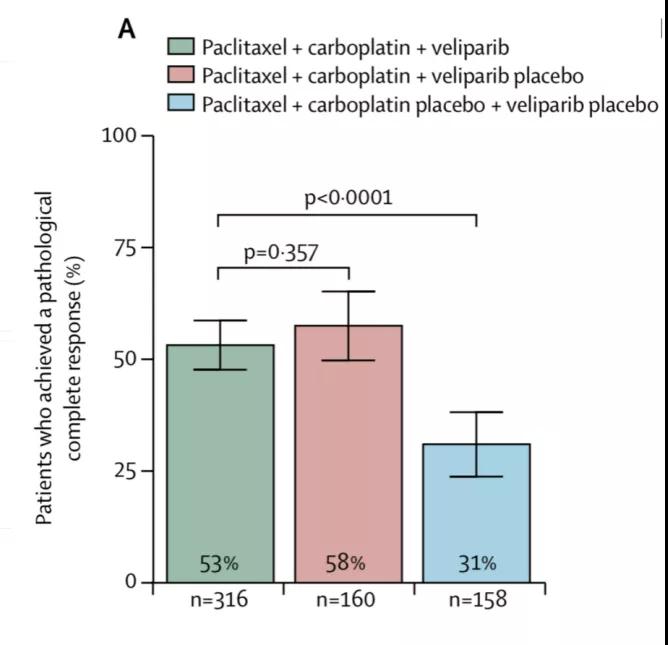 2018年发表于Lancet的BrighTNess研究结果提示(图3),紫杉醇+卡铂组的pCR率显著高于紫杉醇单药组(58% vs 31%, p<0.0001),但紫杉醇+卡铂+Veliparib组与紫杉醇+卡铂组的pCR率无显著性差异(53% vs 58%, p=0.36),说明pCR率的获益来源于卡铂而非Veliparib。