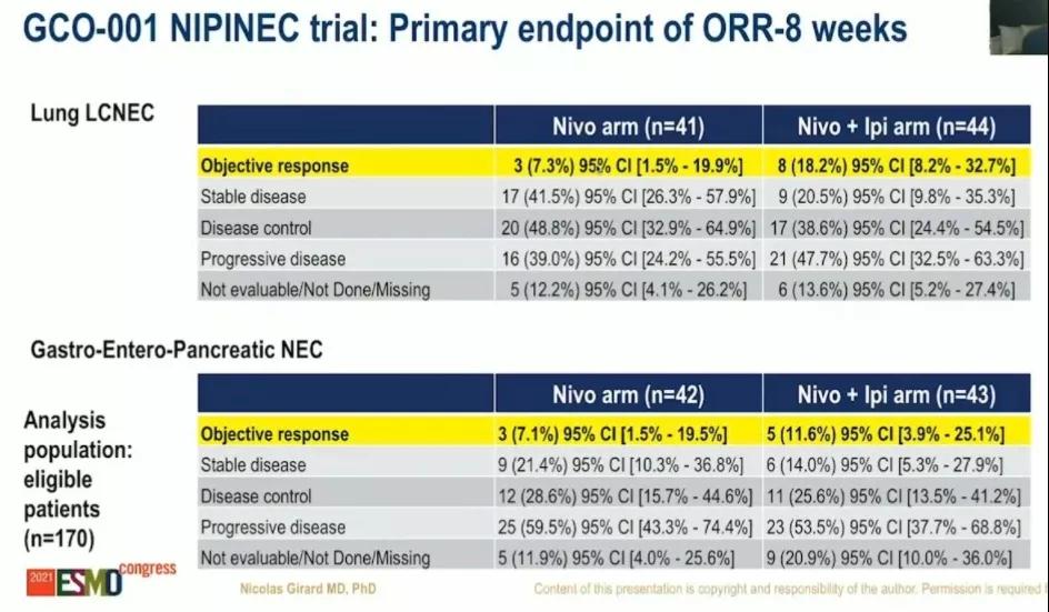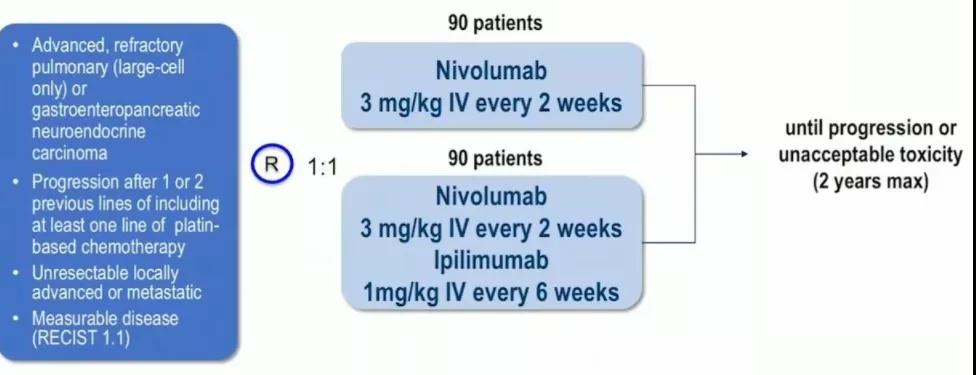 GCO-001 NIPINEC是一项多中心、随机Ⅱ期临床试验。主要纳入标准包括:组织学确诊的NEC(大细胞或小细胞胃肠胰NEC;大细胞肺NEC);二线或三线含铂化疗方案难治性NEC;PS 0-2。纳入研究的患者接受纳武利尤单抗(3 mg/kg,q2w)±伊匹木单抗(1 mg/kg,q6w)治疗,治疗时间持续2年,或直至疾病进展/出现不可耐受的毒性。研究的主要终点为研究者在治疗第8周评估的客观缓解率(ORR),其他终点包括无进展生存期(PFS)、总生存期(OS)和治疗的安全性。