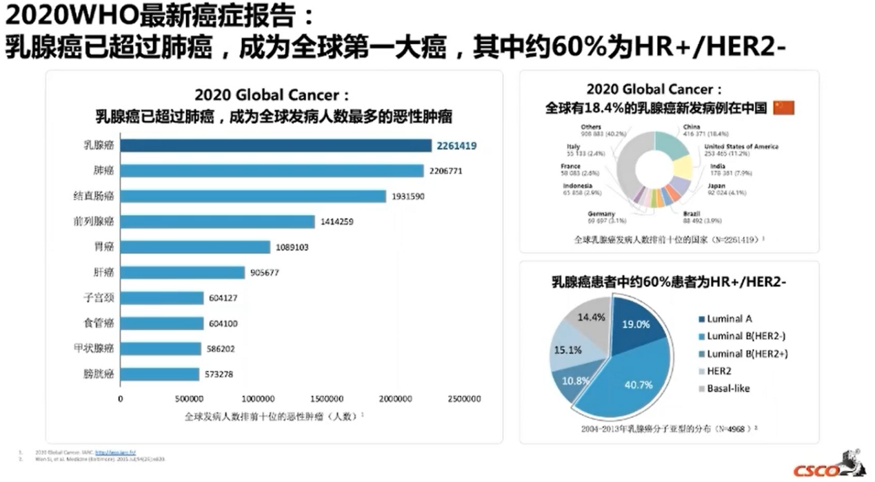 2020年WHO最新报告显示,乳腺癌发病人数已超过肺癌,成为全球第一大癌种,其中约60%的乳腺癌患者为HR+/HER2-,全球有18.4%的乳腺癌新发病例在中国。因此,对于HR+/HER2-乳腺癌的治疗我们需要给予更多的重视。