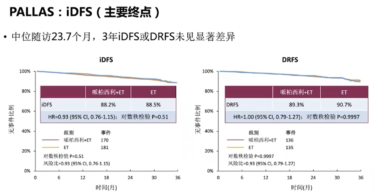 PALLAS研究入组标准为:1.Ⅱ-Ⅲ期HR+/HER2-;2.完成手术±放化疗;3.确诊≤12个月;4.开始辅助内分泌治疗≤6个月,相较于MonarchE研究来说入组患者没有非常高危。该研究共入组5600例患者,1:1随机分为A组:内分泌治疗+Palbociclib(125mg,qd,给药3周停药1周,2年)和B组:单独内分泌治疗。其中只有58.7%的患者具有较高的复发风险:1.≥4枚淋巴结阳性;2.1-3枚淋巴结阳性且≥T3期或组织学分级Ⅲ级。结果显示,中位随访23.7个月,3年iDFS(主要研究终点)或DFRS未见显著差异,亚组分析显示,高危人群同样未取得阳性结果。