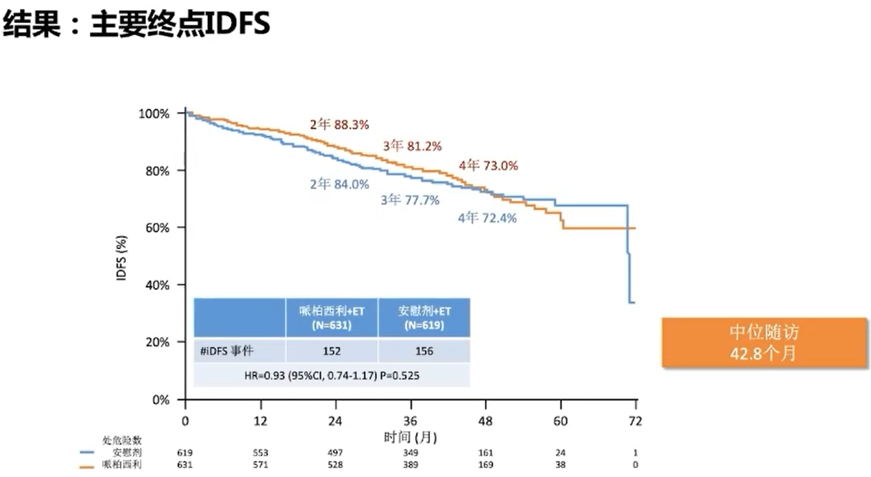 PENELOPE-B研究重点放在了HR+/HER2-原发乳腺癌新辅助化疗后未达pCR的患者中,入组新辅助治疗后完成根治性手术,病理示乳腺或淋巴结残余浸润性病灶的HR+/HER2-乳腺癌患者,1:1随机分为Palbociclib(125mg,qd,1年)+内分泌治疗组或安慰剂+内分泌治疗组。结果显示,在内分泌治疗基础上添加Palbociclib,中位随访42.8个月iDFS(主要研究终点)在第2年和第3年有获益而到第4年两组之间无统计学差异,OS同样在第4年无统计学差异,究其原因可能在于Palbociclib仅使用了1年。类似于PALLAS研究,在PENELOPE-B研究中Palbociclib也显现了高毒性,患者相对总剂量强度仅有75.8%。