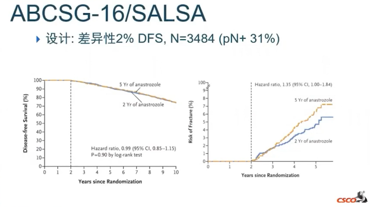 如在ABCSG-16/SALSA研究中,实验设计要求差异性2% DFS为有统计学意义,该项研究共入组3484例患者,其中淋巴结阳性患者占31%,结果显示,在5年阿那曲唑基础治疗上延长2年与延长5年相比,DFS无统计学差异,且延长5年阿那曲唑治疗骨折的发生风险会有增加。