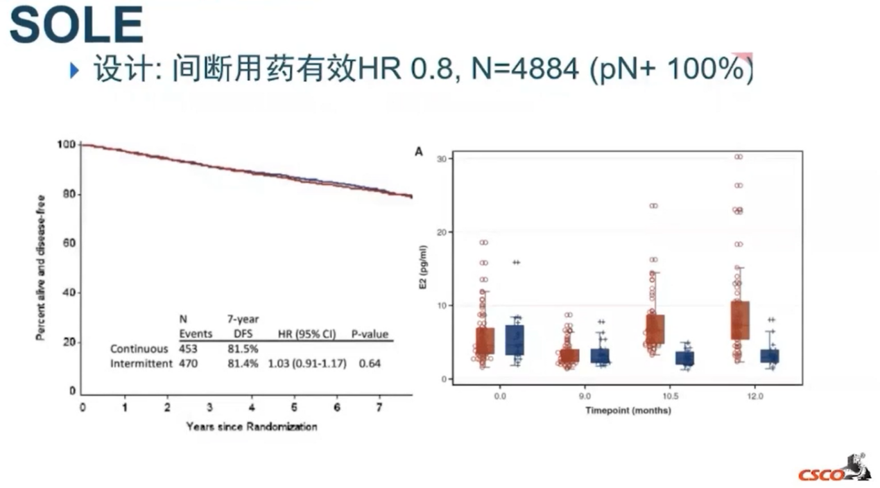 在内分泌治疗延长过程中,研究者也考虑是否可以采用间歇疗法进行治疗。在临床实践中会有一些患者因无法耐受长期服药带来的毒副作用而选择间断用药,扩展到强化治疗中这种间断用药手段能否带来不同的结果?SOLE研究基于此进行了探索,该项研究共入组了4884例患者,且全部为淋巴结阳性。结果显示,持续用药与间断用药两组的获益无统计学差异。不同时间点,两组的雌二醇水平同样无显著差异。