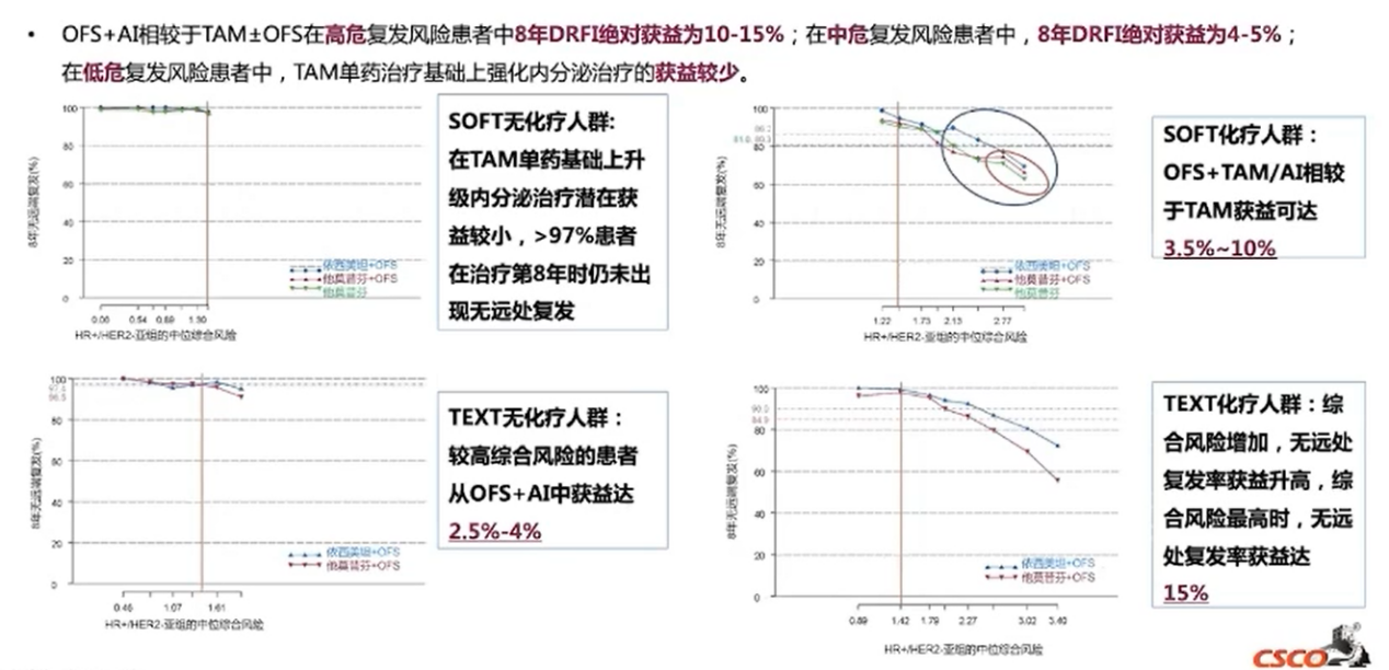 TEXT&SOFT 8年随访STEPP分析显示,SOFT研究无化疗人群中TAM单药基础上升级内分泌治疗潜在获益较小,而在SOFT研究化疗人群中OFS+TAM/AI相较于TAM单药获益可达3.5%~10%。在TEXT研究无化疗人群中高风险患者应用AI+OFS获益可达2.5%~4%,化疗人群中综合风险增加,无远处复发率获益升高;综合风险最高时,无远处复发获益可达15%。综合来看,AI+OFS相较于TAM±OFS在高危人群中8年DRFI绝对获益为10%~15%;在中危人群中,8年DRFI绝对获益为4%~5%;在低危人群中,强化治疗获益较少。