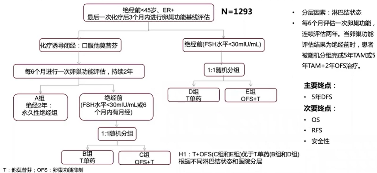 ASTRAR研究探索了TAM+OFS在化疗后未绝经或卵巢功能恢复的HR+乳腺癌内分泌治疗中的作用,该项实验设计对年龄<45岁,绝经前,ER+患者在最后一次化疗后3个月内进行了卵巢功能评估。研究共入组了1293名患者,并将这些患者分为2组:一组为化疗诱导闭经,该组患者口服TAM,每6个月进行一次卵巢功能评估,持续两年,2年后FSH<30mIU/mL或6个月内有月经为绝经前组,否则为永久性绝经组(A组),再将绝经前组的患者1:1随机分为TAM单药组(B组)和TAM+OFS组(C组)。另一组为第一次卵巢功能评估即为绝经前(FSH<30mIU/mL),该组患者同样1:1随机分为TAM单药组(D组)和TAM+OFS组(E组)。主要研究终点为5年的DFS。