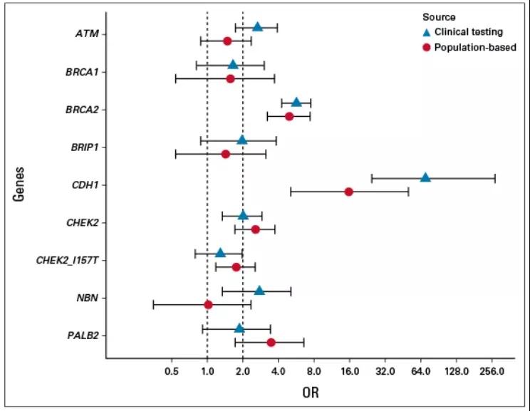 在病例对照分析中,与对照组相比,CDH1和BRCA2突变与乳腺小叶浸润癌的高风险相关(OR>4),CHEK2、ATM和PALB2突变与中度风险相关(OR=2-4)。BRCA1和CHEK2 短臂Ile157Thr变异与乳腺小叶浸润癌的临床相关风险无关(OR<2)。