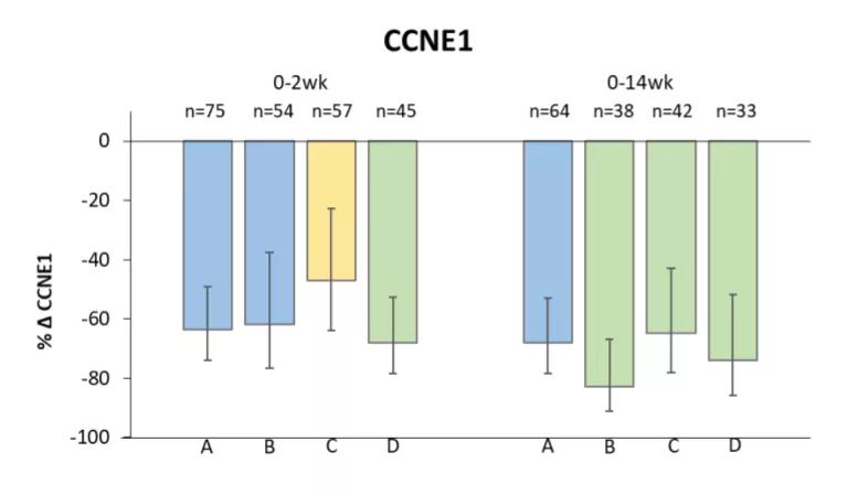 来曲唑在第2周和第14周时使CCND1水平降低约20%,但哌柏西利有增加的趋势。CCNE1水平在显示CCCA的肿瘤中下降82%(中位数),但在无CCCA的肿瘤中没有变化。停药3-9天后,仅有2/9的肿瘤显示CCCA。在开始治疗后(大于或等于)6个月手术的2/4肿瘤中发现ESR1突变。