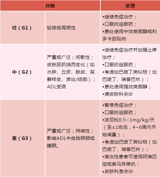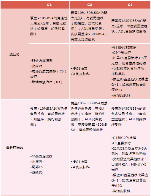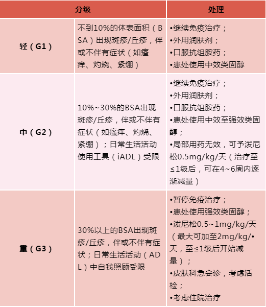 根据不同的斑丘疹cirAEs分级(轻、中、重度),可给予以下不同的处理。