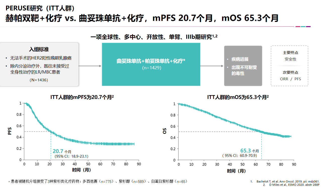另一项单臂的PERUSE研究则进一步证实,曲帕双靶联合不同紫杉类(白紫、多西他赛、紫杉醇)的一线治疗,PFS和OS分别达到20.7个月和65.3个月,尤其是既往未接受曲妥珠单抗(新)辅助治疗的患者OS达到了73.5个月。该研究进一步验证了CLEOPATRA研究的结果。这些研究均表明,HER2阳性乳腺癌患者曲帕双靶一线治疗可使部分患者实现5年长期生存。