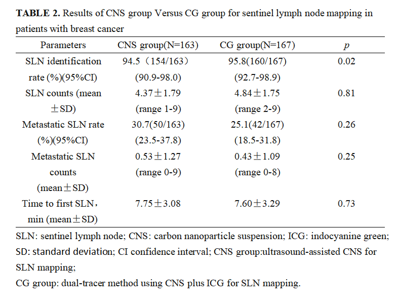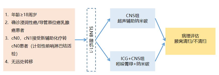 ■ 研究方法:本研究采用非劣效设计,试验组(CNS组)采用超声辅助定位纳米碳示踪组;对照组(CG组)采用吲哚菁绿荧光联合纳米碳双示踪组,按照1∶1比例进行随机入组前哨淋巴活检。纳入标准:①年龄≥18周岁;②确诊浸润性癌/导管原位癌乳腺癌患者;③cN0,cN1接受新辅助化疗转cN0患者(计划性前哨淋巴结活检);④无远处转移。主要终点为SLN检出率;次要研究终点:SLN检出个数、SLN转移个数、SLN转移率、第一枚SLN检出时间、不良反应。