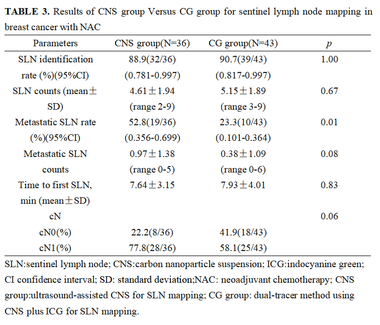 新辅助化疗亚组中CNS组(超声辅助纳米碳示踪组)与CG组(荧光+纳米碳双示踪组)相比,前哨淋巴结检出率:88.9%(32/36)vs.90.7%(39/43),p=1.00无统计学差异;在cN1亚组两组前哨淋巴结检出率分别为:85.7%(24/28,95% CI:71.9~99.5),84.0%(21/25,95% CI:68.6~99.4,p>0.05);前哨淋巴结平均检出个数分别为:4.61(2-9)个,5.15(3-9)个,p>0.05。