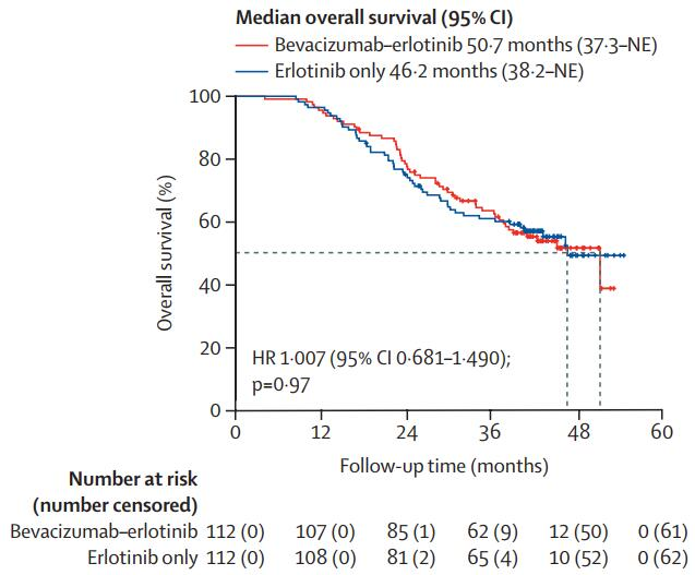 这项开放标签、随机、多中心、III期临床研究共在69家中心进行,纳入IIIb或IV期非小细胞肺癌患者,且患者携带21L858R或19del突变,符合入组标准的患者按照1:1的比例随机接受厄洛替尼150mg,口服,每日一次联合贝伐珠单抗15mg/kg治疗,或单纯接受厄洛替尼口服治疗。研究按照吸烟状态、EGFR突变类型及临床分期进行分层。最终两组均入组112例患者,经过中位39.2个月的随访后,两组中位OS分别为50.7个月和46.2个月,HR=1.07,P=0.97。