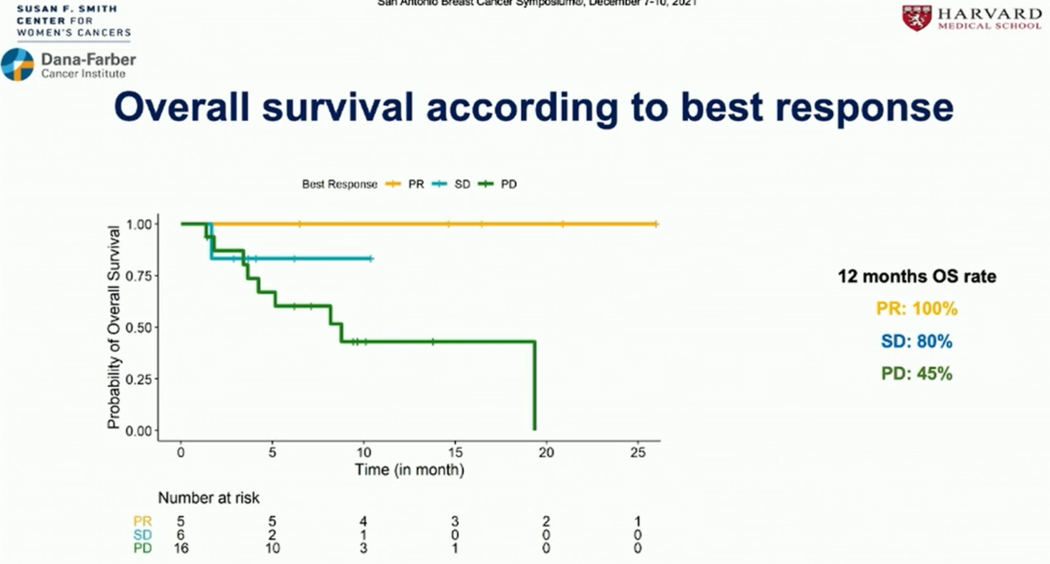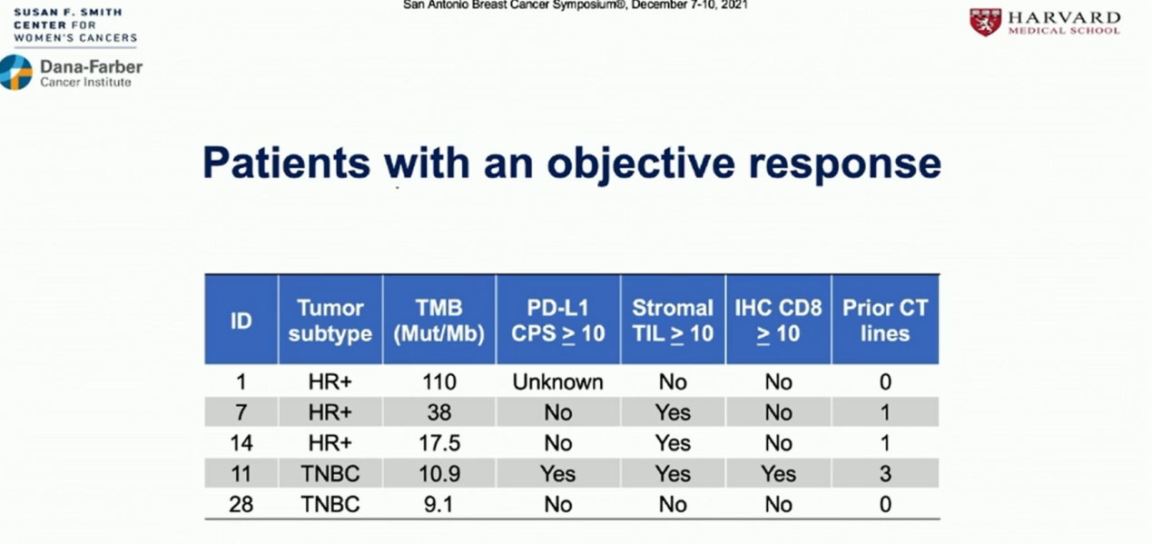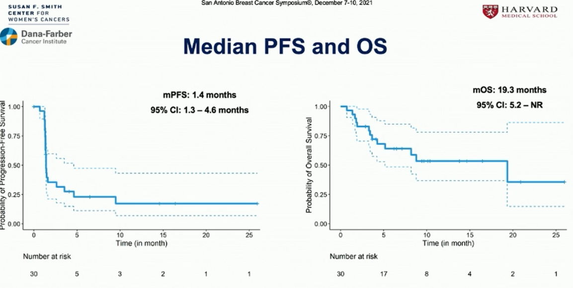 ■ 研究结果:2019年2月至2021年6月,来自3个不同学术机构的31例患者被纳入该研究。在30名开始研究治疗的患者中,中位年龄为63岁,21名激素受体阳性(HR+)乳腺癌,9名三阴性乳腺癌(TNBC),化疗中位线数为1.5(0-3)。在9例TNBC患者中,7例PD-L1状态已知(3例阳性,4例阴性)。中位TMB为10.9 Mut/Mb,16.7%(n=5)患者的TMB≥14 Mut/Mb。