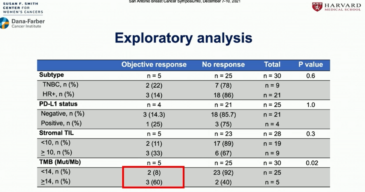 中位随访9.7个月(4.4~16.4)后,5例(16.7%)患者达到了确认的客观缓解(全部为部分缓解),满足了本研究的主要终点。探索性分析未显示HR状态和PD-L1状态所致缓解率差异,TMB≥14 mut/Mb和<14mut/Mb组的缓解率分别为60% vs 8%(p=0.02),存在显著性统计学差异。