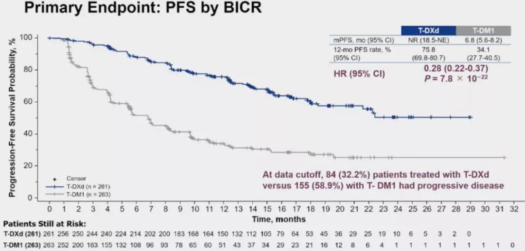 既往数据分析,该项研究已显示达到了主要终点,T-DXd组由盲态独立中心(BICR)评估的PFS有显著改善(HR0.28,95%CI:0.22-0.37;P=7.8x10-22),T-DXd组和T-DM1组的中位PFS分别为NR和6.8个月(95%CI:5.6~8.2);T-DXd组和T-DM1组的ORR则分别为79.7%和34.2%。