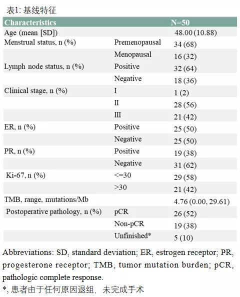研究结果:最终有50例样本获得合格的测序分析报告,基线特征见表1,其中发现了142种基因突变,频率最高的分别为TP53(80%),PIK3CA(46%),ERBB2(8%),NF1(8%), NBN(8%),ATRX(8%)。在体细胞拷贝数变异方面,共发现了43种基因的扩增、融合或拷贝数缺失,频率最高的为ERBB2扩增(74%),其次是MYC(26%),CKD12(14%),CCND1(12%)和ZNF217(12%)扩增。