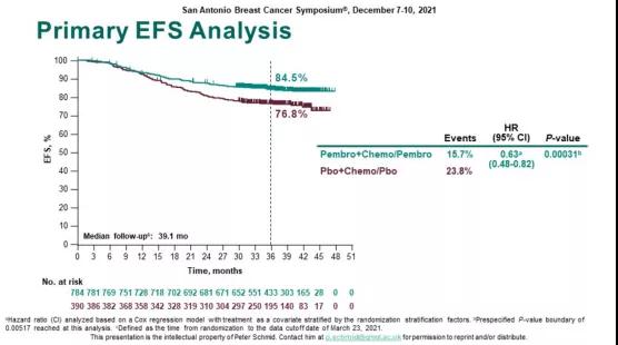 该研究入组了1174例早期TNBC患者(AJCC分期:T1c N1-2或T2-4 N0-2),按2:1比例随机接受帕博利珠单抗或安慰剂联合紫杉醇+卡铂(4周期)+阿霉素或表阿霉素+环磷酰胺,术后患者接受辅助帕博利珠单抗或安慰剂治疗9周期或至复发或不可耐受的毒性。经过中位39.1个月随访,截止到2021年3月23日,两组EFS分别为84.5%对比76.8%(HR=0.63,P=0.00031)。