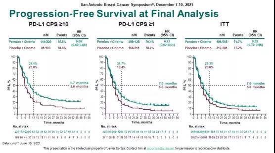 数据截止到2021年6月15日,经过中位44个月的随访,分析显示,OS的HR(95% CI)在CPS≥10亚组为0.73(0.55~0.95),在CPS≥1亚组为0.86(0.72~1.04),在ITT人群为0.89(0.76~1.05);PFS的HRs(95% CI)在CPS≥10亚组、CPS≥1亚组和ITT人群中分别为0.66(0.50~0.88)、0.75(0.62~0.91)和0.82(0.70~0.98)。