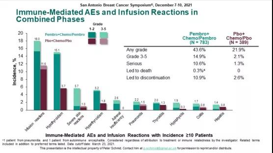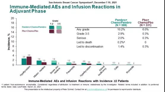 安全性数据与各药物既往毒性谱一致,辅助帕博利珠单抗期间免疫相关AE的发生率为10.2%、其中3级及以上的发生率为2.9%。