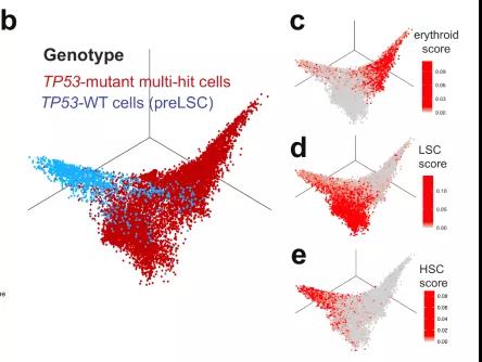 为了描述TP53驱动转化的肿瘤系统发育、细胞层次和分子特征,研究者对来自35个供体和40个时间点(对照组、慢性期MPN、AML前和TP53突变sAML;图a)的22116个造血干细胞和祖细胞(HSPC)进行单细胞多组目标序列分析(PMID:33377019和30765193)。TARGET seq独特地支持单细胞突变分析,具有平行转录组和细胞表面蛋白质组读数的等位基因分辨率。