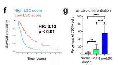 sAML样本的综合转录组学分析(图b)显示了三个主要群体:1)以红系特征为特征的TP53突变簇(图c,例如KLF1、GATA1、GYPA),由于没有病例显示红系白血病的诊断特征,这是一个意外发现;2)一个LSC TP53突变体簇(图d);3)一个TP53-WT白血病前期簇(图e)。LSC簇显示关键干细胞调节因子的失调,由此研究者得出一个独立AML队列中具有预后影响的48基因LSC新评分(HR=3.13;图f)。重要的是,无论de novo 和sAML的TP53状态如何,该评分都可以预测结果,表明其更广泛的潜在临床效用。