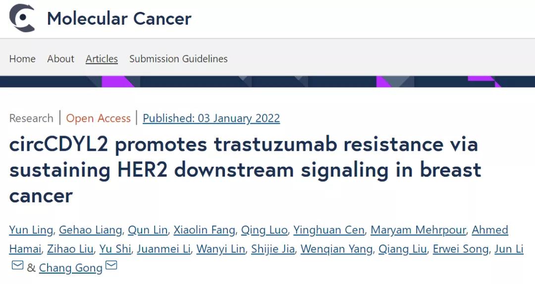 曲妥珠单抗是HER2阳性乳腺癌的重要治疗手段,但临床中仍有近三成左右的患者难以避免发生曲妥珠单抗耐药。阐明耐药机制、寻找逆转耐药策略,是当前研究的一大热点和难点。近日,中山大学孙逸仙纪念医院龚畅教授团队在肿瘤学顶级期刊《分子癌症》(Molecular Cancer,IF=27.4016)发表了题为“circCDYL2 promotes trastuzumab resistance via sustaining HER2 downstream signaling in breast cancer”的研究论文,首次揭示了circRNA circCDYL2在曲妥珠单抗耐药中的重要作用,提供了全新的逆转耐药策略。该论文的第一作者为Yun Ling、Gehao Liang和Qun Lin,通讯作者为龚畅教授、中山大学中山医学院李隽教授。