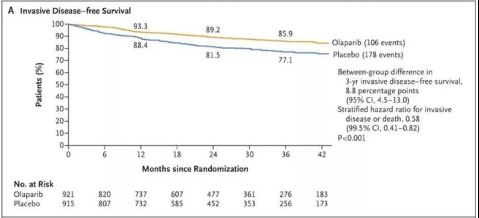 ΔOlympiA研究奥拉帕利组和安慰剂组的iDFS K-M曲线