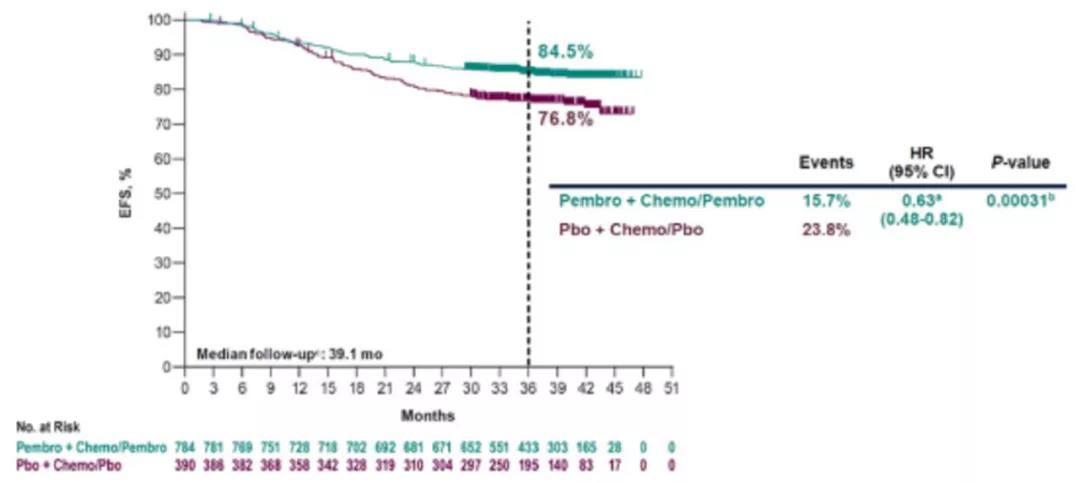 TNBC的另一个好消息是,免疫治疗开始进入早期(新)辅助治疗领域,比如KEYNOTE-522研究获得了积极结果,帕博利珠单抗(新)辅助治疗能够提高pCR率,也能够提高患者术后的EFS率。