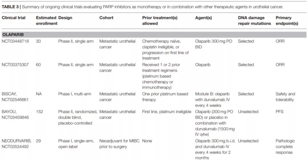 奥拉帕利在尿路上皮癌领域的多项研究正在进行中,包括NCT03448718、NCT03375307、BISCAY研究等都是基于DDRm选择的Ⅰ/Ⅱ期单臂研究,而BAYOU研究是一项随机双盲对照的Ⅱ期研究,旨在评价度伐利尤单抗+奥拉帕利或安慰剂+奥拉帕利用于不适合铂类治疗的Ⅳ期尿路上皮癌患者。该研究入组患者为既往经过一线治疗,而且无论是否存在DDRm,但研究的主要终点是HRRm患者的PFS(研究者评估,RECIST v1.1)。次要终点是OS、DOR、ORR等。