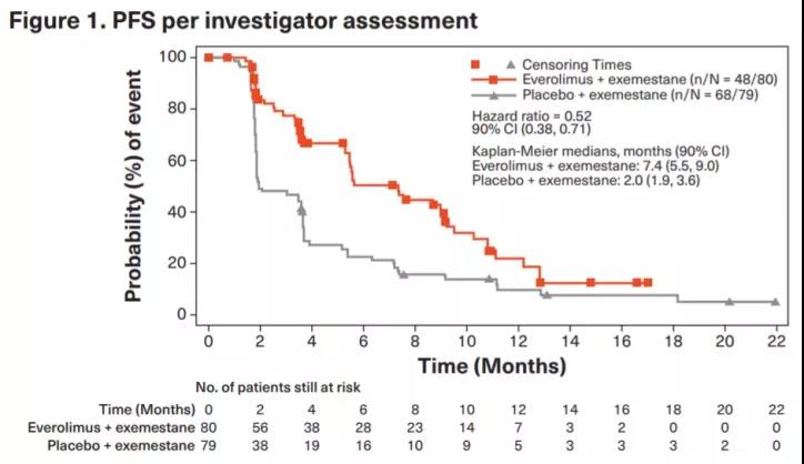 2021年ESMO公布了基于中国人群的BOLERO-5临床研究数据,该研究旨在评估PI3K/Akt/mTOR抑制剂依维莫司+依西美坦治疗中国绝经后ER+/HER2-晚期乳腺癌的疗效,结果显示与安慰剂组相比,依维莫司组中位PFS显著延长了5.4 个月(7.4个月vs 2.0个月,HR=0.52,90%CI:0.38~0.71),针对中国患者的BOLERO-5研究取得了与BOLERO-2一致的结果。