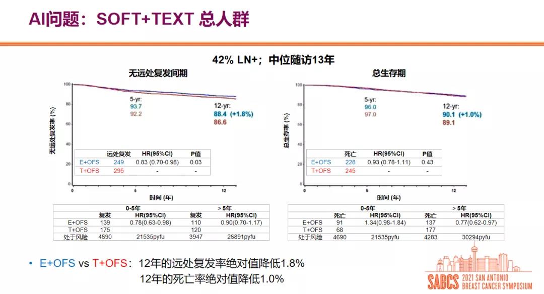 绝经前HR+乳腺癌患者的治疗依然聚焦于OFS的强化内分泌治疗,2021 SABCS大会公布了SOFT & TEXT联合试验随访12年的更新结果,显示与OFS+TAM相比,OFS+AI组的DFS获益依旧显著,12年DFS率分别为80.5%和75.9%(绝对获益率为4.6%,HR 0.79,95%CI:0.70~0.90)。而其他次要终点也有不同程度改善,12年BCFI率和DRFI率分别提高4.1%和1.8%,12年OS率提高1.0%(90.1% vs. 89.1%;HR=0.93,95%CI:0.78~1.11)。