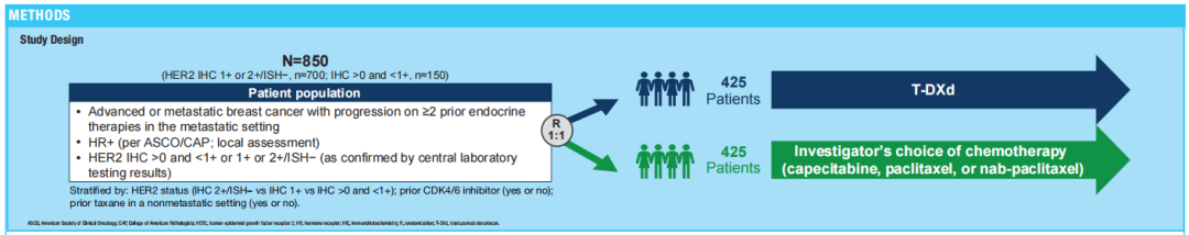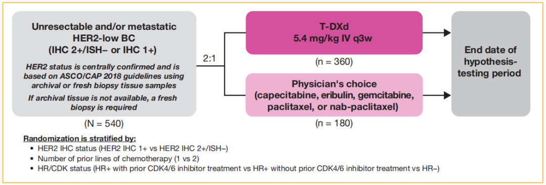 这项研究计划入组540例HER2低表达(IHC 2+且ISH?或IHC 1+)、既往接受过1或2线化疗的不可切除或转移性乳腺癌患者,按照2:1比例随机分配至T-DXd组(5.4 mg/kg IV q3w)或研究者选择方案组(卡培他滨、艾立布林、吉西他滨、紫杉醇或白紫);主要终点是独立盲法中心(BICR)评估HR阳性、HER2低表达患者的PFS。近日,药企已宣布DESTINY-Breast04研究达到了主要终点,即T-DXd相较于研究者选择方案,可显著降低HR阳性、HER2低表达患者的疾病进展或死亡风险。而且关键次要终点也有获益,包括无论HR状态(阳性或阴性)、HER2低表达患者的PFS,以及HR阳性、HER2低表达患者和无论HR状态(阳性或阴性)患者的OS均有改善。