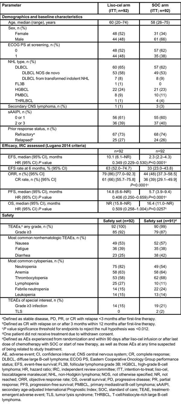 每组92例患者,两组的基线特征平衡。在lisocel组,89例患者接受lisocel,1例患者的细胞产品不合格,2例患者未接受输注(由于生产失败和快速进展,各1名);58例(63%)接受桥接治疗。在接受SOC治疗的91例患者中(1例患者撤回知情同意),28例患者通过化疗获得CR,43例患者接受BEAM+ASCT,50例患者后续再次接受lisocel治疗。