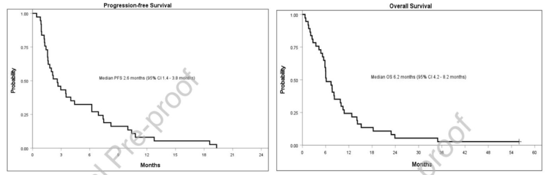 所有入组患者的中位年龄为66岁,ORR和DCR分别为13.5%和59.5%,中位PFS仅为2.6个月,中位OS为6.2个月,1年OS率为24%,安全性与耐受性与其他二线治疗数据相似,但是有11%的患者出现2-3级肺炎。