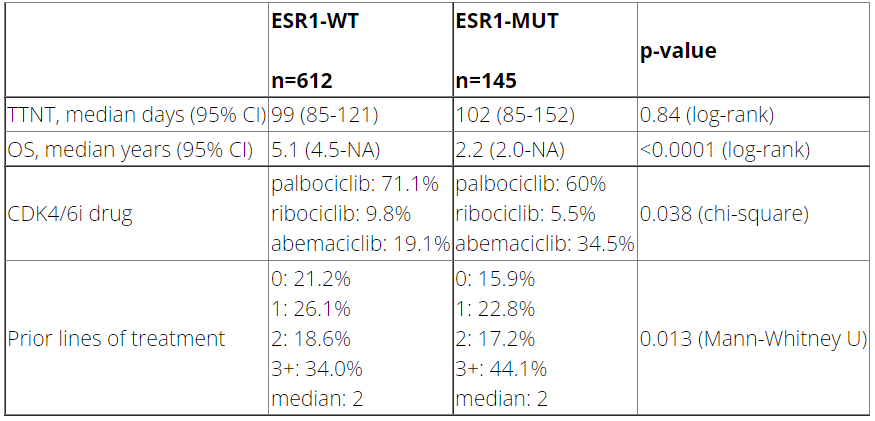 方法:真实世界的证据来源于GuardantInform商业付款人索赔数据库和170000多名个人的ctDNA检测。MBC患者在CDK4/6i开始治疗后的30天内进行ctDNA检测以确定患者是ESR1-MUT(突变型)还是ESR1-WT(野生型),并分析患者的至下次治疗时间(TTNT)。另外,从学术癌症中心的临床病理数据库中提取了通过组织RNA序列检测到的ESR1-FUS病例。