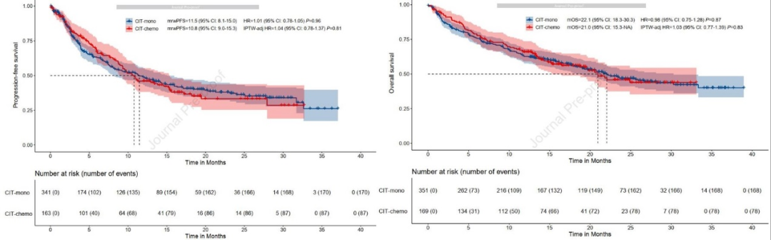 研究结果:该研究共纳入520例非鳞、非小细胞肺癌患者,单药治疗组和联合治疗组分别入组351例和169例患者。患者年龄在单药治疗组年龄更大,女性占比两组分别为52%和44%。基线时,两组分别有26%和30%的患者存在脑转移,分别12%和17%的患者存在肝脏转移。从诊断到治疗开始的中位时间分别为1.1个月和0.92个月。数据分析时,两组分别有28%和30%的患者仍然接受治疗, 44%和47%的患者疾病进展后接受后续治疗。