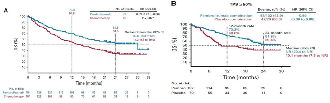 前瞻性研究中,KeyNote-024探索的是单药Pembrolizumab在PD-L1≥50%患者中的疗效及安全性,而KeyNote-189则是探索化疗联合Pembrolizumab在非鳞非小细胞肺癌中的疗效及安全性,其中涵盖了PD-L1≥50%的亚组分析。通过这两项研究的间接比较,或许可以得到宝贵的线索。KeyNote-024研究中,患者的中位PFS为10.0个月,中位OS为27个月左右,2年OS率为51.5%;而KeyNote-189研究在PD-L1≥50%的亚组患者中,其PFS和OS分别为11.1个月和未达到,2年OS率为51.9%。可以看到,在PD-L1≥50%的人群中,单药Pembrolizumab或联合化疗,两者的中位PFS和2年OS率相差无几。