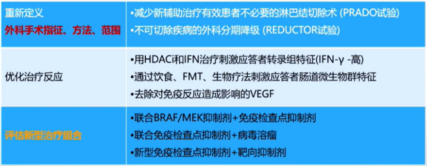 未来黑色素瘤新辅助治疗试验的方向包括重新定义外科手术指征、方法、范围,优化治疗反应和评估新型治疗组合等。