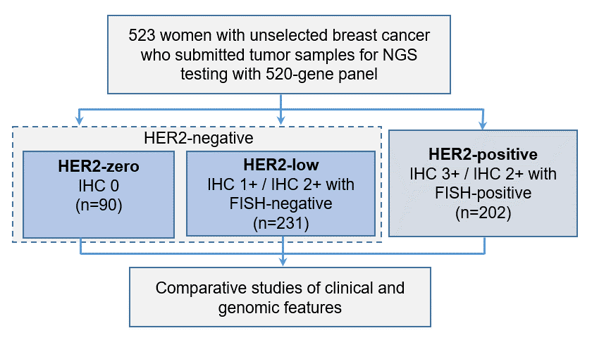 在本研究中,我们回顾性分析了523例中国人群女性乳腺癌患者的520个基因大Panel二代基因测序的数据及临床病理数据,按照肿瘤的HER2状态把研究队列分层为HER2零表达(IHC 0),HER2低表达(IHC 1+/2+且FISH阴性),以及HER2阳性(IHC 3+或2+且FISH阳性)三个亚型,对三组患者的临床病理特征、基因突变图谱、治疗结局及生存数据进行了深入的研究及对比,以进一步检验HER2低表达亚组作为独立乳腺癌亚型的可行性。