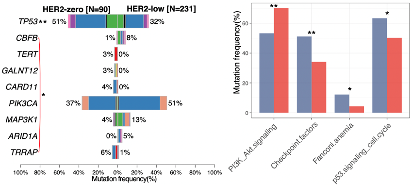 在本研究中,我们检测了523例中国女性乳腺癌患者中不同HER2受体状态亚组基于二代测序的基因变异图谱及其临床病理特征。在临床特征方面,与HER2零表达的患者相比,HER2低表达患者更倾向于激素受体阳性,Ki67低表达,新辅助治疗后pCR率更低。而在分子特征方面,与HER2零表达肿瘤相比,HER2低表达肿瘤的基因变异图谱及信号通路突变方面具有明显的差异,表现为更高的PIK3CA突变率以及更低的TP53突变率。